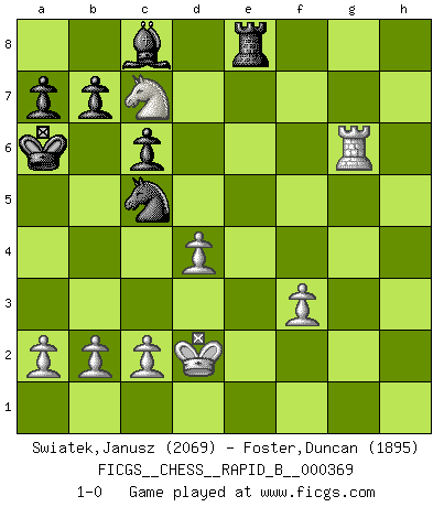 Last move : 1-0 2021 December 17 19:11:31 [Event "FICGS__CHESS__RAPID_B__000369"] [Site "FICGS"] [Date "2021.10.17"] [Round "1"] [White "Swiatek,Janusz"] [Black "Foster,Duncan"] [Result "1-0"] [WhiteElo "2069"] [BlackElo "1895"] 1.e4 c6 2.d4 d5 3.e5 Bf5 4.h4 h6 5.g4 Bh7 6.e6 Qd6 7.exf7+ Kxf7 8.Nf3 Nd7 9.Bh3 e6 10.Nc3 Ngf6 11.g5 hxg5 12.Nxg5+ Ke8 13.Nxe6 Bg8 14.Bf4 Qe7 15.Qe2 Rxh4 16.Nxg7+ Kd8 17.Nf5 Qxe2+ 18.Nxe2 Rh7 19.Nfg3 Ne8 20.f3 Bd6 21.Nf5 Kc7 22.Nxd6 Nxd6 23.Kd2 Rf7 24.Rag1 Re8 25.Rg6 Rf6 26.Rhg1 Be6 27.Rxf6 Nxf6 28.Rg7+ Kb6 29.Bxd6 Bxh3 30.Bc5+ Ka6 31.Nf4 Bc8 32.Rg6 Nd7 33.Nxd5 Nxc5 34.Nc7+ 1-0 Caro-Kann : Advance variation Player White won this chess game. Follow this game move after move (download)A strong memory, concentration, imagination, and a strong will is required to become a great Chess player. (Bobby Fischer) Vielleicht wirkt die Aura früherer Spieler glanzvoller als die der heutigen Spieler, aber das liegt daran, dass man kein Programm wie Fritz hatte, das einem all die Löcher in ihren Partien zeigt. (Vladimir Kramnik) Aunque la mayoría de la gente disfruta observar las partidas de los grandes Maestros de ataque, algunos de los jugadores mas notables en la historia han sido los jugadores silenciosos posicionales. Lentamente ellos te aplastan despojandote de tu espacio, congestionando tus piezas y dejandote virtualmente sin nada que hacer. (Yasser Seirawan) Les erreurs sont comme les malheurs, elles n'arrivent jamais seules. (Siegbert Tarrasch) To err is human, to shift the blame on someone else is tactical. (Mladen Jankovic)