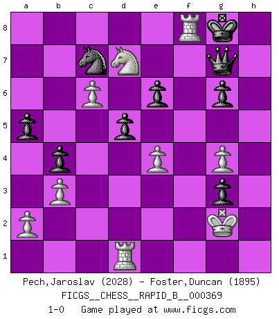 Last move : 1-0 2022 March 25 13:45:49 [Event "FICGS__CHESS__RAPID_B__000369"] [Site "FICGS"] [Date "2021.10.17"] [Round "1"] [White "Pech,Jaroslav"] [Black "Foster,Duncan"] [Result "1-0"] [WhiteElo "2028"] [BlackElo "1895"] 1.d4 f5 2.c4 Nf6 3.Nc3 g6 4.Nf3 Bg7 5.g3 O-O 6.Bg2 c6 7.O-O d6 8.b3 Na6 9.Bb2 Qe8 10.d5 Bd7 11.Nd4 Rc8 12.Rb1 Nc7 13.Qd2 cxd5 14.cxd5 Qf7 15.Rbc1 a5 16.Bf3 b5 17.Nc6 Bxc6 18.dxc6 b4 19.Na4 Rb8 20.Bg2 Qe6 21.Qd3 Qf7 22.Rfd1 Ng4 23.Bd5 e6 24.Bxg7 Qxg7 25.Bf3 d5 26.Bxg4 fxg4 27.Nc5 Rf5 28.Nd7 Re8 29.e4 Rf3 30.Qe2 h5 31.h3 Re7 32.Rc2 h4 33.hxg4 Ref7 34.Kg2 Rxf2+ 35.Qxf2 Rxf2+ 36.Rxf2 hxg3 37.Rf8+ 1-0 Dutch with c4 & Nc3 Kingside Castling by player Black (move 5) Kingside Castling by player White (move 7) Player White won this chess game. Follow this game move after move (download)Avoid the crowd. Do your own thinking independently. Be the Chess player, not the Chess piece. (Ralph Charell) Kein Großmeister ist normal. Sie unterscheiden sich nur im Ausmaß Ihrer Verrücktheit. (Viktor Kortschnoi) No es suficiente ser un buen jugador, se debe también de jugar bién. (Siegbert Tarrasch) Les écrivains ont utilisé les échecs pour analyser les côtés extrêmes de la nature humaine. Dans ce cadre, les échecs offrent un champ d'expérimentation idéal. Mais on pourrait faire la même chose avec la peinture. Et là, en vous référant à Van Gogh, vous ne tirerez pas de conclusion définitive sur les peintres. (Gary Kasparov) Life is verb, not a noun. (Charlotte Perkins Gilman)