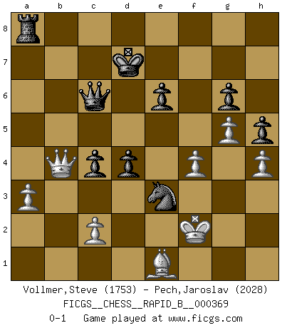 Last move : 0-1 2022 January 24 10:31:37 [Event "FICGS__CHESS__RAPID_B__000369"] [Site "FICGS"] [Date "2021.10.17"] [Round "1"] [White "Vollmer,Steve"] [Black "Pech,Jaroslav"] [Result "0-1"] [WhiteElo "1753"] [BlackElo "2028"] 1.e4 e6 2.d4 d5 3.Nc3 Bb4 4.e5 c5 5.a3 Bxc3+ 6.bxc3 Ne7 7.f4 Qa5 8.Bd2 Qa4 9.Nf3 b6 10.Qb1 Ba6 11.Qb3 Qd7 12.Bxa6 Nxa6 13.O-O c4 14.Qb2 Qa4 15.Rab1 O-O-O 16.g4 Rdf8 17.Nh4 h5 18.g5 g6 19.Be1 Kb7 20.Nf3 Nf5 21.Bf2 Nb8 22.Nh4 Nxh4 23.Bxh4 Nc6 24.Qa2 Rb8 25.Rf3 Kc8 26.Be1 Kd7 27.h4 b5 28.Bd2 b4 29.cxb4 Nxd4 30.Rc3 a5 31.bxa5 Qxa5 32.Kf1 Nf5 33.Rd3 Rxb1+ 34.Qxb1 Qa6 35.Rxd5+ exd5 36.Bc3 Ra8 37.e6+ fxe6 38.Qb4 d4 39.Be1 Qc6 40.Kf2 Ne3 0-1 French : Winawer, Advance, 6...Ne7 Kingside Castling by player White (move 13) Queenside Castling by player Black (move 15) Player Black won this chess game. Follow this game move after move (download)Chess is a foolish expedient for making idle people believe they are doing something very clever when they are only wasting their time. (George Bernard Shaw) Versuche, dich von der Sklaverei der Eröffnungsvarianten zu befreien. Stattdessen soll man gewisse Typenpositionen erlernen, die man eingehend analysiert. (Aaron Nimzowitsch) Con el fin de mejorar tu juego, debes de estudiar los finales antes que todo, ya que mientras que los finales pueden ser estudiados y dominados por sí mismos, el juegomedio y la apertura deben de ser estudiados en relación con los finales. (José Raúl Capablanca) La vie et les Echecs sont tous les deux une lutte constante. (Lasker) There will be no order, only chaos. (Sol Robeson in Pi by Darren Aronofsky)
