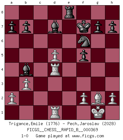 Last move : 1-0 2022 January 18 21:25:0 [Event "FICGS__CHESS__RAPID_B__000369"] [Site "FICGS"] [Date "2021.10.17"] [Round "1"] [White "Trigance,Emile"] [Black "Pech,Jaroslav"] [Result "1-0"] [WhiteElo "1776"] [BlackElo "2028"] 1.c4 e5 2.Nc3 Nc6 3.Nf3 f5 4.d4 e4 5.d5 exf3 6.dxc6 fxg2 7.cxd7+ Qxd7 8.Qxd7+ Bxd7 9.Bxg2 c6 10.Be3 Be6 11.b3 Bb4 12.Bd4 Kf7 13.O-O Rd8 14.e3 Rxd4 15.exd4 Bxc3 16.Rad1 Nf6 17.Rd3 Bb4 18.Rfd1 Re8 19.d5 cxd5 20.cxd5 Bd7 21.Rd4 1-0 English : Three knights system Kingside Castling by player White (move 13) Player White won this chess game. Follow this game move after move (download)In blitz, the Knight is stronger than the Bishop. (Vlastimil Hort) Wer sich die Fähigkeit anerziehen will im Schach selbstständig zu denken, der muß alles meiden, was leblos ist: ausgeklügelte Theorien, die sich auf sehr wenige Beispiele und eine Menge Hirngespinste stützen. (Emanuel Lasker) A través de las casillas del tablero, los Indios explican el movimiento del tiempo y la edad, las influencias mas altas que controlan el mundo y los lazos que vinculan al Ajedrez con el alma humana. (Al-Masudi) Le système Elo représente seulement une moyenne. Il est simplement un indicateur de votre stabilité. (Anatoli Karpov) The weakness of an artist is dogma. (Josh Waitzkin)