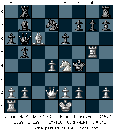 Last move : 1-0 2021 October 28 5:22:0 [Event "FICGS__CHESS__THEMATIC_TOURNAMENT__000248"] [Site "FICGS"] [Date "2021.10.17"] [Round "1"] [White "Wiaderek,Piotr"] [Black "Brand Lyard,Paul"] [Result "1-0"] [WhiteElo "2193"] [BlackElo "1677"] 1.d4 d5 2.Nf3 Nf6 3.c4 e6 4.Nc3 c6 5.Qd3 dxc4 6.Qxc4 b5 7.Qd3 a6 8.g4 Nxg4 9.Bf4 Nd7 10.Bg2 Bb4 11.Rg1 Bxc3+ 12.Qxc3 Qb6 13.Nd2 Rb8 14.Bxc6 Ke7 15.Rxg4 Bb7 16.Qb4+ Kf6 17.Ne4+ Kf5 18.Rg5+ Kxf4 19.Qd2+ 1-0 Queen's pawn game Player White won this chess game. Follow this game move after move (download)A player surprised is half beaten. (Proverb) Jeder leidlich begabte Spieler, er braucht keineswegs hervorragend veranlagt zu sein, kann es zum Meister bringen. Aber das ist ja auch gar nicht nötig! Der richtige Standpunkt ist es, zu seinem Vergnügen zu spielen, und man glaube ja nicht, dass der Genuss proportional dem Können sei. (Siegbert Tarrasch) Si yo gano un torneo, yo lo gano por mí mismo. Yo hago las jugadas. Nadie me ayuda. (Bobby Fischer) On entre au jeu d'Echecs comme on entre en Religion. Pour le joueur d'Echecs, la partie d'Echecs c'est l'office, la messe, le défilé du 1er Mai, le dépôt de gerbe au Monument aux Morts. C'est un drame sacré. (Michel Roos) Memory... is the diary that we all carry with us. (Oscar Wilde, The Importance of Being Earnest)