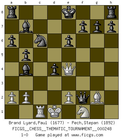 Last move : 1-0 2022 January 18 22:26:21 [Event "FICGS__CHESS__THEMATIC_TOURNAMENT__000248"] [Site "FICGS"] [Date "2021.10.17"] [Round "1"] [White "Brand Lyard,Paul"] [Black "Pech,Stepan"] [Result "1-0"] [WhiteElo "1677"] [BlackElo "1892"] 1.d4 d5 2.Nf3 Nf6 3.c4 e6 4.Nc3 c6 5.Qd3 dxc4 6.Qxc4 b5 7.Qd3 a6 8.g4 Nxg4 9.Bh3 Nf6 10.Bg5 Bb7 11.Bxf6 Qxf6 12.Ne5 c5 13.Rg1 Nc6 14.Qe4 cxd4 15.Nb1 Qxe5 16.Bg2 Qxh2 17.Nd2 Qxg1+ 18.Nf1 Bb4+ 19.Kd1 Qxf2 20.Rc1 1-0 Queen's pawn game Player White won this chess game. Follow this game move after move (download)Pawns: they are the soul of this game, they alone form the attack and defense. (Philidor) Stil? Ich habe keinen Stil! (Anatoly Karpov) El Ajedrez, como cualquier actividad creativa, solo puede existir a través del esfuerzo combinado de aquellos que tienen talento creativo y de aquellos que poseen la habilidad de organizar su trabajo creativo. (Mikhail Botvinnik) Seul un grand joueur sait à quel point il joue faiblement. (Xavier Tartacover) Never was anything great achieved without danger. (Niccolo Machiavelli)