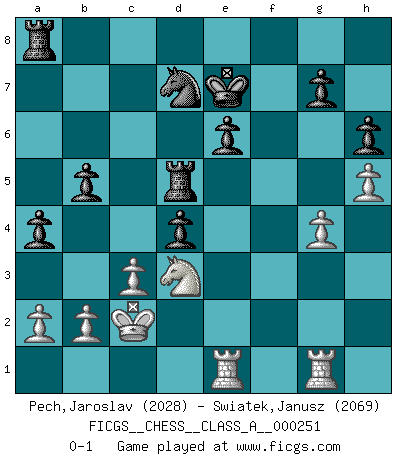 Last move : 0-1 2022 June 11 0:27:25 [Event "FICGS__CHESS__CLASS_A__000251"] [Site "FICGS"] [Date "2021.10.23"] [Round "1"] [White "Pech,Jaroslav"] [Black "Swiatek,Janusz"] [Result "0-1"] [WhiteElo "2028"] [BlackElo "2069"] 1.e4 c6 2.d4 d5 3.Nc3 dxe4 4.Nxe4 Bf5 5.Ng3 Bg6 6.h4 h6 7.Nf3 Nd7 8.h5 Bh7 9.Bd3 Bxd3 10.Qxd3 Ngf6 11.Bf4 e6 12.O-O-O Be7 13.Kb1 O-O 14.Ne4 Nxe4 15.Qxe4 Nf6 16.Qe2 Qd5 17.Ne5 Qe4 18.Qxe4 Nxe4 19.Rhe1 Nf6 20.g4 Bd6 21.f3 b5 22.Nd3 Be7 23.c3 a5 24.Kc2 a4 25.Re2 Rfd8 26.Bc7 Rd7 27.Bb6 Rd5 28.Bc5 Bxc5 29.Nxc5 Kf8 30.Nd3 Nd7 31.R2e1 Ke7 32.f4 Nf6 33.Rg1 Nd7 34.Rde1 c5 35.f5 cxd4 36.fxe6 fxe6 0-1 This chess game has been lost on time (started : 2021.10.23 1:11:56) Caro-Kann : Classical, 7...Nd7 Queenside Castling by player White (move 12) Kingside Castling by player Black (move 13) Player Black won this chess game. Follow this game move after move (download)There are two classes of men; those who are content to yield to circumstances and who play whist; those who aim to control circumstances, and who play Chess. (Mortimer Collins) Im Hotelzimmer gab es nur zwei Schaben. (Über die Turnierbedingungen) (Peter Swidler) Una de estas pequeñas movidas modestas pudieran ser mas molestas a tu oponente que la amenaza mas grande. (Siegbert Tarrasch) Ce n'est pas pour s'amuser qu'il joue aux échecs : il célèbre un culte. (Vladimir Nabokov) You cannot beat a roulette table unless you steal money from it. (Albert Einstein)