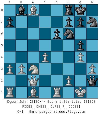 Last move : 0-1 2022 March 2 14:52:49 [Event "FICGS__CHESS__CLASS_A__000251"] [Site "FICGS"] [Date "2021.10.23"] [Round "1"] [White "Dyson,John"] [Black "Gounant,Stanislas"] [Result "0-1"] [WhiteElo "2130"] [BlackElo "2197"] 1.Nf3 d5 2.g3 Nf6 3.Bg2 c6 4.O-O Bg4 5.h3 Bh5 6.d4 e6 7.c4 Be7 8.Nc3 O-O 9.Ne5 Nbd7 10.g4 Bg6 11.Nxg6 hxg6 12.b3 Rc8 13.e3 g5 14.a3 Nh7 15.Qc2 Bd6 16.e4 Bb8 17.cxd5 cxd5 18.Re1 dxe4 19.Bxe4 Ndf6 20.Bxb7 Qc7 21.Bxc8 Qh2+ 0-1 Reti : King's Indian attack, Yugoslav variation Kingside Castling by player White (move 4) Kingside Castling by player Black (move 8) Player Black won this chess game. Follow this game move after move (download)Before the endgame, the Gods have placed the middle game. (Siegbert Tarrasch) Ich verstehe mehr vom Schach als irgendein anderer lebender Meister. (José Raúl Capablanca) Aún deseo matar a Fischer. (Boris Spassky) Vous n'êtes pas toujours obligé de jouer le meilleur coup. Un coup doit être actif, entreprenant, correct et beau ! (David Bronstein) All war is based on deception. (Sun Tzu)