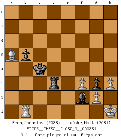 Last move : 0-1 2022 November 1 13:25:52 [Event "FICGS__CHESS__CLASS_A__000251"] [Site "FICGS"] [Date "2021.10.23"] [Round "1"] [White "Pech,Jaroslav"] [Black "LaDuke,Matt"] [Result "0-1"] [WhiteElo "2028"] [BlackElo "2081"] 1.d4 Nf6 2.c4 g6 3.Nc3 d5 4.cxd5 Nxd5 5.e4 Nxc3 6.bxc3 Bg7 7.Nf3 c5 8.Be3 Bg4 9.Rc1 O-O 10.Be2 Qa5 11.Qd2 Nd7 12.d5 c4 13.h3 Bxf3 14.Bxf3 Nc5 15.O-O Nd3 16.Rc2 e6 17.Be2 exd5 18.Bxd3 cxd3 19.Qxd3 Rad8 20.c4 d4 21.Bd2 Qb6 22.a4 Rfe8 23.a5 Qc6 24.f3 Bf8 25.Rb2 b6 26.Rfb1 Bc5 27.Ra2 Qd6 28.Rba1 Qe5 29.axb6 axb6 30.Be1 g5 31.Bf2 h5 32.Kh1 g4 33.Bg1 g3 34.Rd1 h4 35.Rda1 Kh7 36.Re1 Kg8 37.Rea1 Kg7 38.Ra7 Qe6 39.Rc7 Ra8 40.Bxd4+ Kg8 41.Bc3 Rxa1+ 42.Bxa1 Ra8 43.Bc3 Bb4 44.Bb2 Qd6 45.Qxd6 Bxd6 46.Rd7 Bc5 47.Rd1 Ra4 48.Bf6 Bf2 49.Rc1 Be3 50.Rb1 Kh7 51.Bxh4 Bf2 52.Bg5 Rxc4 53.Bd2 Rc2 54.Bb4 Kh6 55.Be7 Kg6 56.Bd6 Ra2 57.Bc7 f6 58.Bd6 Rd2 59.Bb4 Rd3 60.Be1 Re3 61.Bd2 Rd3 62.Be1 b5 63.Bb4 f5 64.exf5+ Kxf5 65.Ba5 Kf6 66.Bb4 Ke5 67.Ba5 Kd6 68.Bb4+ Kd5 69.Ba5 Kc4 0-1 This chess game has been lost on time (started : 2021.10.23 1:11:56) King's Indian defense, 3.Nc3 Kingside Castling by player Black (move 9) Kingside Castling by player White (move 15) Player Black won this chess game. Follow this game move after move (download)In a gambit you give up a Pawn for the sake of getting a lost game. (Samuel Standige Boden) Ich trinke, ich rauche, ich spiele, ich liebe Frauen aber Fernschach ist ein Laster, das ich nicht habe. (Mikhail Nekhemyevich Tal) El Peón aislado arroja penumbra sobre todo el tablero. (Aaron Nimzovich) Des points faibles ou des trous dans la position de l'adversaire doivent être occupés par des pièces et non pas par des pions. (Siegbert Tarrasch) Memory is a crazy woman that hoards colored rags and throws away food. (Austin O'Malley)