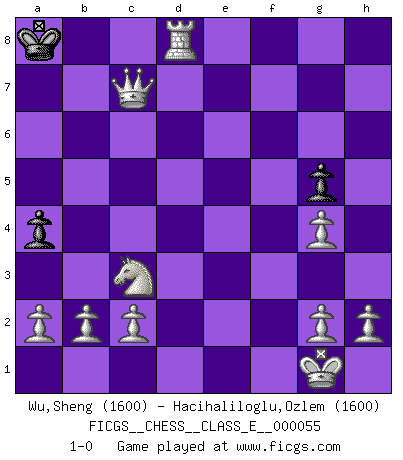 Last move : 1-0 2007 July 31 8:47:55 [Event "FICGS__CHESS__CLASS_E__000055"] [Site "FICGS"] [Date "2007.07.21"] [Round "1"] [White "Wu,Sheng"] [Black "Hacihaliloglu,Ozlem"] [Result "1-0"] [WhiteElo "1600"] [BlackElo "1600"] 1.e4 e5 2.Nf3 d6 3.d4 exd4 4.Nxd4 c5 5.Bb5+ Nc6 6.Nxc6 bxc6 7.Bxc6+ Bd7 8.Bxa8 Qxa8 9.Nc3 Nf6 10.O-O a5 11.Re1 a4 12.Bf4 Ng4 13.f3 h6 14.fxg4 f6 15.Bxd6 g5 16.e5 fxe5 17.Rxe5+ Kf7 18.Qf1+ Kg6 19.Qd3+ Kg7 20.Bxf8+ Qxf8 21.Qxd7+ Kg8 22.Re8 Rh7 23.Rxf8+ Kxf8 24.Qxh7 Ke8 25.Qxh6 Kd7 26.Rd1+ Kc7 27.Qd6+ Kb7 28.Qxc5 Ka6 29.Rd6+ Kb7 30.Qc7+ Ka8 31.Rd8+ 1-0 Philidor : Exchange variation Kingside Castling by player White (move 10) Player White won this chess game. Follow this game move after move (download)Do you realize Fischer almost never has any bad pieces? He exchanges them, and the bad pieces remain with his opponents. (Yuri Balashov) Wenn Spassky eine Figur opfert kannst du genauso gut aufgeben. Aber wenn Tal eine Figur opfert, spiel weiter. Er könnte noch eine weitere opfern, und dann ... wer weiß? (Miguel Najdorf) Aquel que toma al Peón de Caballo de la Reina, se pasará la noche a dormir en la calle. (Anónimo) Les Cavaliers se révèlent fort utiles dans les positions fermées. D'habitude, les Fous sont un peu plus forts que les Cavaliers dans les positions ouvertes. Qu'on le veuille ou non, il restera toujours des exceptions ! Crush them ! Make them suffer ! (General Grievous in Star Wars ep.3)