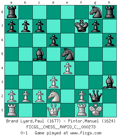 Last move : 0-1 2021 October 29 2:11:5 [Event "FICGS__CHESS__RAPID_C__000273"] [Site "FICGS"] [Date "2021.10.24"] [Round "1"] [White "Brand Lyard,Paul"] [Black "Pintor,Manuel"] [Result "0-1"] [WhiteElo "1677"] [BlackElo "1624"] 1.e4 e5 2.Bc4 Nc6 3.d3 Bc5 4.Nf3 Qf6 5.Bg5 Qg6 6.O-O d6 7.h3 h6 8.Bh4 Bxh3 9.Bg3 Qxg3 10.Bxf7+ Kxf7 11.Nxe5+ Nxe5 12.Nd2 Qxg2+ 0-1 Bishop's Opening Kingside Castling by player White (move 6) Player Black won this chess game. Follow this game move after move (download)A great player and a great example for many. His book My 60 Memorable Games had a big impact on me. It is a shame he didn't continue to enrich the world of chess with his unparalleled understanding after 1972. (Jan Timman, about Bobby Fischer's death) Ja, ich habe einmal eine Blitzpartie gespielt, es war in einem Zug, 1929. --im Interview 1989 (Mikhail Moiseyevich Botvinik) El Ajedrez te enseña a controlarl la excitación inicial que sientes cuando vez algo que parece bueno y te enseña a pensar objetivamente cuando te encuentras en problemas. (Stanley Kubrick) Nous sommes les pions de la mystérieuse partie d'Echecs jouée par Dieu. Il nous déplace, nous arrête, nous pousse encore, puis nous lance un à un dans la boîte du Néant. Epitaphe sur la tombe de David Janowsky (1868-1927). Don't be irreplaceable, if you can't be replaced, you can't be promoted. (Dan Rotaru)