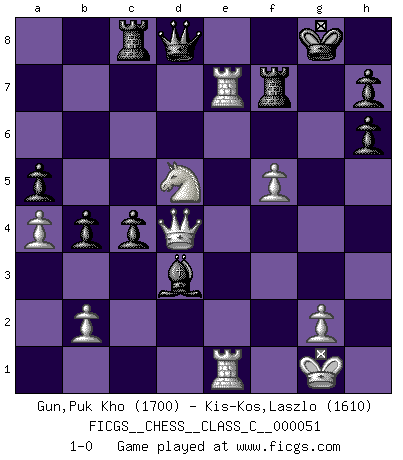Last move : 1-0 2008 January 17 14:20:17 [Event "FICGS__CHESS__CLASS_C__000051"] [Site "FICGS"] [Date "2007.07.22"] [Round "1"] [White "Gun,Puk Kho"] [Black "Kis-Kos,Laszlo"] [Result "1-0"] [WhiteElo "1700"] [BlackElo "1610"] 1.Nf3 d5 2.d4 Nf6 3.c4 c6 4.e3 e6 5.Bd3 dxc4 6.Bxc4 c5 7.O-O Bd7 8.Nc3 Nc6 9.d5 exd5 10.Nxd5 Bd6 11.Ng5 Bxh2+ 12.Kxh2 Ne5 13.Bb3 c4 14.Ba4 b5 15.Bc2 Nfg4+ 16.Kg1 Qxg5 17.e4 Qd8 18.Bf4 f6 19.f3 Nh6 20.Bxh6 gxh6 21.a4 b4 22.Qd4 a5 23.f4 Ng4 24.Bd1 O-O 25.Bxg4 Bxg4 26.f5 Be2 27.Rfe1 Bd3 28.e5 fxe5 29.Rxe5 Rf7 30.Rae1 Rc8 31.Re7 1-0 Reti Opening Kingside Castling by player White (move 7) Kingside Castling by player Black (move 24) Player White won this chess game. Follow this game move after move (download)Pawn endings are to Chess what putting is to golf. (Cecil Purdy) Über Frauen: Chess is better. (Robert James Fischer) Un entendimiento a fondo de las continuaciones típicas del mate, hace de las combinaciones de sacrificio mas complicadas conducirlas a ellas no solo sin dificultad, sino casi de una manera natural. (Siegbert Tarrasch) Il (Jacob Murray) ne joue pas pour le bon coup, mais pour le meilleur. (Eloi Relange) Life doesn't imitate art, it imitates bad television. (Woody Allen)