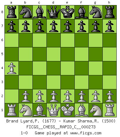 Last move : 1-0 2021 November 23 15:51:10 [Event "FICGS__CHESS__RAPID_C__000273"] [Site "FICGS"] [Date "2021.10.24"] [Round "1"] [White "Brand Lyard,Paul"] [Black "Kumar Sharma,Raushan"] [Result "1-0"] [WhiteElo "1677"] [BlackElo "1500"] 1.a4 1-0 This chess game has been lost on time (started : 2021.10.24 3:22:5) Ware (Meadow Hay) Opening Player White won this chess game. Follow this game move after move (download)Look at Garry Kasparov. After he loses, invariably he wins the next game. He just kills the next guy. That's something that we have to learn to be able to do. (Maurice Ashley) Wenn Du absolut nicht mehr weißt, was Du tun sollst, dann ist es Zeit für Panik. (John van der Wiel) ¿Porque tengo que perder ante este idiota?. (Aron Nimzovich) Horreur, mais aussi harmonie suprême : qu'y avait-il en effet au monde en dehors des échecs ? Le brouillard, l'inconnu, le non-être... (Vladimir Nabokov) There is no vagueness without wind. (Chinese proverb)