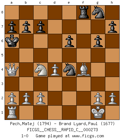 Last move : 1-0 2021 December 17 0:16:55 [Event "FICGS__CHESS__RAPID_C__000273"] [Site "FICGS"] [Date "2021.10.24"] [Round "1"] [White "Pech,Matej"] [Black "Brand Lyard,Paul"] [Result "1-0"] [WhiteElo "1794"] [BlackElo "1677"] 1.e4 e5 2.f4 exf4 3.Nf3 d5 4.exd5 Qxd5 5.Nc3 Qe6+ 6.Be2 Bb4 7.O-O Bxc3 8.Bb5+ Bd7 9.Re1 Be5 10.Rxe5 Bxb5 11.Rxe6+ fxe6 12.Nd4 Bd7 13.Qh5+ g6 14.Qe5 Na6 15.Qxh8 Ke7 16.Qg7+ Kd6 17.Nf3 Nc5 18.d4 Ne4 19.Bxf4+ Kc6 20.Ne5+ Kb6 21.Qxd7 Rf8 22.Nc4+ Ka6 23.Qa4+ 1-0 KGA : Abbazia defense (Classical defense, Modern defense!) Kingside Castling by player White (move 7) Player White won this chess game. Follow this game move after move (download)Chess is a beautiful mistress. (Bent Larsen) Schachspieler können ausgezeichnet Varianten am Schachbrett berechnen, aber nicht im realen Leben. Zu stark ist der Individualismus im Schach ausgeprägt, und für viele ist ein kleiner momentaner persönlicher Vorteil wichtiger als ein weit größerer Vorteil von morgen. (Anatoly Karpov) Yo nunca en mi vida he jugado la Defensa Francesa, que viene siendo la más aburrida de todas las Aperturas. (Wilhelm Steinitz) Shah mat. Le roi est mort. Cri de fierté d'un joueur venant de terrasser son adversaire, courtoisement, sans effusion de sang. Real knowledge is to know the extent of one's ignorance. (Confucius)