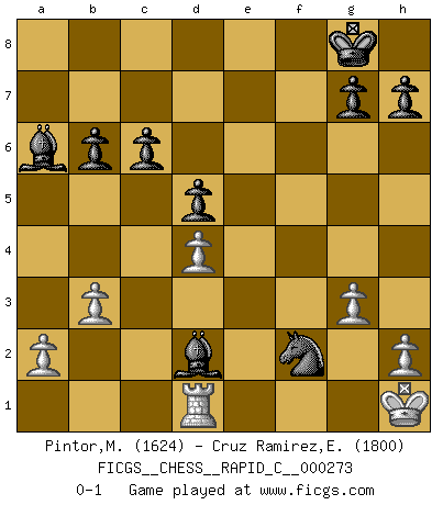 Last move : 0-1 2021 November 6 17:58:14 [Event "FICGS__CHESS__RAPID_C__000273"] [Site "FICGS"] [Date "2021.10.24"] [Round "1"] [White "Pintor,Manuel"] [Black "Cruz Ramirez,Eliecer"] [Result "0-1"] [WhiteElo "1624"] [BlackElo "1800"] 1.e4 e6 2.f4 c5 3.Nf3 d5 4.exd5 exd5 5.d4 Nf6 6.Bb5+ Nc6 7.O-O Be7 8.Ne5 Qb6 9.Bxc6+ bxc6 10.c3 O-O 11.Kh1 Re8 12.Qf3 cxd4 13.cxd4 Ne4 14.Nc3 f6 15.Ng4 Bd6 16.Ne2 Ba6 17.Nxf6+ Nxf6 18.Be3 Rxe3 19.Qxe3 Re8 20.Qb3 Rxe2 21.Qxb6 axb6 22.b3 Ne4 23.Rfe1 Rxe1+ 24.Rxe1 Bxf4 25.g3 Bd2 26.Rd1 Nf2+ 0-1 French : Labourdonnais variation Kingside Castling by player White (move 7) Kingside Castling by player Black (move 10) Player Black won this chess game. Follow this game move after move (download)Excellence at Chess is one mark of a scheming mind. (Sir Arthur Conan Doyle) Wenn Du nicht kämpfst, um anderen etwas zu beweisen, sondern nur für Dich selbst, dann bist du fast unbesiegbar. (Garry Kasparov) Cuando tengas duda... ¡juega al Ajedrez!. (Tevis) J'apprécie les joueurs d'est-indienne, c'est grâce à eux que je nourris ma famille depuis tant d'années. (Petrosian) I'll be back. (Arnold Schwarzenegger)