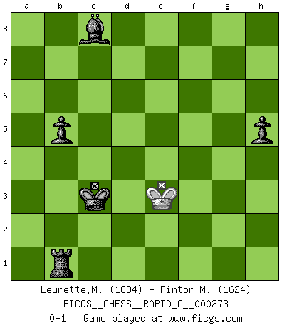 Last move : 0-1 2021 November 12 12:41:15 [Event "FICGS__CHESS__RAPID_C__000273"] [Site "FICGS"] [Date "2021.10.24"] [Round "1"] [White "Leurette,Marc-Antoine"] [Black "Pintor,Manuel"] [Result "0-1"] [WhiteElo "1634"] [BlackElo "1624"] 1.e4 e5 2.Nf3 Nc6 3.Bc4 Bc5 4.c3 Qf6 5.b4 Bb6 6.a4 a6 7.a5 Ba7 8.d3 h6 9.b5 axb5 10.Bxb5 Nge7 11.O-O O-O 12.Bxc6 Nxc6 13.c4 d6 14.Nc3 Qg6 15.Nd5 Bg4 16.Kh1 Kh8 17.Nxc7 Rac8 18.Nb5 Bd4 19.Ra2 f5 20.exf5 Rxf5 21.Be3 Rcf8 22.Nh4 Qh5 23.f3 Qxh4 24.Nxd4 Nxd4 25.Bxd4 exd4 26.Raf2 Bh5 27.g3 Qf6 28.Kg2 g5 29.h3 g4 30.hxg4 Bxg4 31.Qe2 Bh5 32.Qe4 Qg7 33.Qh4 Rxa5 34.f4 Bg6 35.Rf3 Ra3 36.f5 Ra2+ 37.Kh3 Be8 38.f6 Bd7+ 39.g4 Qg6 40.R1f2 Rxf2 41.Rxf2 Qxd3+ 42.Kg2 Qe4+ 43.Kg3 Qe5+ 44.Rf4 Qe3+ 45.Rf3 Qg1+ 46.Kh3 Rf7 47.Qh5 Qh1+ 48.Kg3 Qe1+ 49.Kg2 Qe2+ 50.Rf2 Qxg4+ 51.Qxg4 Bxg4 52.Kg3 h5 53.Rd2 Rxf6 54.Rxd4 Kg7 55.Re4 Be6 56.Kh4 Kg6 57.Rd4 Bg4 58.Rd5 Kf7 59.c5 dxc5 60.Rxc5 Rb6 61.Kg5 Rb1 62.Rc7+ Ke6 63.Rc8 b5 64.Rb8 Kd5 65.Kf4 Kc4 66.Ke3 Kc3 67.Rc8+ Bxc8 0-1 Giuoco Piano Kingside Castling by player White (move 11) Kingside Castling by player Black (move 11) 10 pieces endgame at move 53 : White KRP , Black KRBPPPP WHITE : King + 1 Rook 1 Pawn BLACK : King + 1 Rook 1 Bishop 4 Pawns 9 pieces endgame at move 54 : White KRP , Black KRBPPP WHITE : King + 1 Rook 1 Pawn BLACK : King + 1 Rook 1 Bishop 3 Pawns 8 pieces endgame at move 59 : White KR , Black KRBPPP WHITE : King + 1 Rook BLACK : King + 1 Rook 1 Bishop 3 Pawns 7 pieces endgame at move 60 : White KR , Black KRBPP WHITE : King + 1 Rook BLACK : King + 1 Rook 1 Bishop 2 Pawns 6 pieces endgame at move 67 : White K , Black KRBPP WHITE : King + BLACK : King + 1 Rook 1 Bishop 2 Pawns Player Black won this chess game. Follow this game move after move (download)All I want to do, ever, is just play Chess. (Bobby Fischer) Weshalb minderdergeübte Spieler mit g2-g4 beginnen? Die betreffenden sind unschlüssig, ob sie nun rechts (h4) oder links (f4) beginnen sollen, und in ihrer Ratlosigkeit entschliessen sie sich nach guter Bürgerart dazu, den goldenen Mittelweg zu wählen. (Aaron Nimzowitsch) Yo he agregado estos principios a la ley: pongan los Caballos en acción antes de que los dos Alfiles sean desarrollados. (Emanuel Lasker) Aidez vos pièces, elles vous aideront. (Paul Morphy) It is a good thing for an uneducated man to read books of quotations. (Winston Churchill)