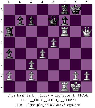 Last move : 1-0 2021 November 4 8:59:20 [Event "FICGS__CHESS__RAPID_C__000273"] [Site "FICGS"] [Date "2021.10.24"] [Round "1"] [White "Cruz Ramirez,Eliecer"] [Black "Leurette,Marc-Antoine"] [Result "1-0"] [WhiteElo "1800"] [BlackElo "1634"] 1.e4 e5 2.f4 d6 3.Nf3 Nc6 4.Nc3 Nf6 5.Bb5 Bd7 6.d3 a6 7.Bxc6 Bxc6 8.fxe5 dxe5 9.Nxe5 Bd7 10.d4 Bb4 11.O-O Bxc3 12.bxc3 O-O 13.Bg5 h6 14.Bxf6 gxf6 15.Nxd7 Qxd7 16.Rxf6 a5 17.Qh5 Ra6 18.Raf1 Qe7 19.e5 a4 20.Qxh6 1-0 King's gambit Kingside Castling by player White (move 11) Kingside Castling by player Black (move 12) Player White won this chess game. Follow this game move after move (download)Chess is a terrible game. If you have no center, your opponent has a freer position. If you do have a center, then you really have something to worry about ! (Siegbert Tarrasch) Schach ist mein Leben, meine Leidenschaft, was ich gelernt habe und seit meinem 14. Lebensjahr profimässig praktiziere. Darauf zu verzichten, würde mir sehr schwer fallen. (Viktor Kortschnoi) El juego de Damas es para vagabundos. (Paul Morphy) D'abord les bases : Jouez et étudiez, puis étudiez et jouez, ensuite jouez et étudiez, puis étudiez et jouez. Deuxièmement : Donnez toujours le meilleur de vous-même ! (Ken Smith) See no evil, hear no evil, speak no evil. (The 3 monkeys)