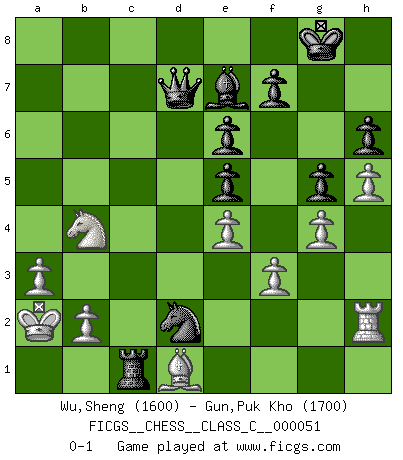 Last move : 0-1 2008 January 3 18:0:33 [Event "FICGS__CHESS__CLASS_C__000051"] [Site "FICGS"] [Date "2007.07.22"] [Round "1"] [White "Wu,Sheng"] [Black "Gun,Puk Kho"] [Result "0-1"] [WhiteElo "1600"] [BlackElo "1700"] 1.e4 c5 2.Nf3 d6 3.d4 cxd4 4.Nxd4 Nf6 5.Nc3 g6 6.Be3 Bg7 7.f3 Bd7 8.Qd2 Nc6 9.O-O-O Rc8 10.g4 h6 11.h4 Ne5 12.Kb1 a6 13.h5 g5 14.Rh3 e6 15.Nb3 Bf8 16.Qf2 Qc7 17.Bb6 Qb8 18.Na5 Be7 19.Be2 Bc6 20.Nxc6 Rxc6 21.Ba7 Qc7 22.Bd4 b5 23.a3 Qb7 24.Na2 Rc8 25.Qg3 Nc6 26.Be3 O-O 27.Bd3 Ne5 28.Bd4 Nfd7 29.Qe1 Nc5 30.Be2 Rfd8 31.c3 a5 32.Bxe5 dxe5 33.Rh1 Nb3 34.Rh2 b4 35.cxb4 axb4 36.Nxb4 Rxd1+ 37.Bxd1 Rc1+ 38.Ka2 Qd7 39.Qd2 Nxd2 0-1 Sicilian : Dragon, Yugoslav attack Queenside Castling by player White (move 9) Kingside Castling by player Black (move 26) Player Black won this chess game. Follow this game move after move (download)The battle for the ultimate truth will never be won. And that's why Chess is so fascinating. (Hans Kmoch) Ich spiele 70 Eröffnungssysteme. (Viktor Kortschnoi) El Ajedrez demanda una total concentración. (Bobby Fischer) Même si l'adversaire joue le coup analysé précédemment, recommencez l'analyse en voyant la nouvelle position. Première règle de Blumenfeld There are three kinds of lies: lies, damned lies and statistics. (Mark Twain)