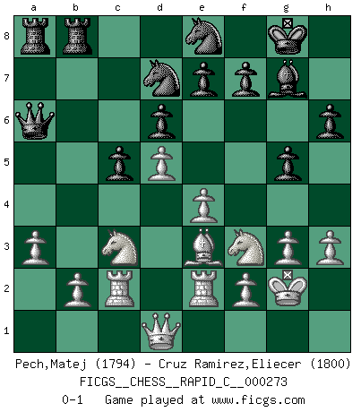 Last move : 0-1 2021 December 19 6:25:7 [Event "FICGS__CHESS__RAPID_C__000273"] [Site "FICGS"] [Date "2021.10.24"] [Round "1"] [White "Pech,Matej"] [Black "Cruz Ramirez,Eliecer"] [Result "0-1"] [WhiteElo "1794"] [BlackElo "1800"] 1.d4 Nf6 2.c4 c5 3.d5 b5 4.cxb5 a6 5.bxa6 Bxa6 6.Nc3 g6 7.e4 Bxf1 8.Kxf1 d6 9.Nf3 Bg7 10.g3 O-O 11.Kg2 Nbd7 12.h3 Qb6 13.Re1 Rfb8 14.Re2 Qa6 15.Bg5 h6 16.Be3 g5 17.Rc1 Rb4 18.a3 R4b8 19.R1c2 Ne8 0-1 Benko gambit accepted Kingside Castling by player Black (move 10) Player Black won this chess game. Follow this game move after move (download)The Pin is mightier than the sword. (Fred Reinfeld) Ich tröste mich mit dem Vergnügen, daß Schachfans, Zuschauer und Leser glücklich sind, wenn ein Großmeister etwas riskiert, statt nur Klötzchen zu schieben. (Mikhail Nekhemyevich Tal) Solo puedes ser bueno en el Ajedrez si amas al juego. (Bobby Fischer) Le pion, dans sa simplicité, marche droit devant lui, mais lorsqu'il prend, il le fait obliquement? Ainsi l'homme, tant qu'il reste pauvre, marche dans la droiture et vit honnêtement, mais lorsqu'il recherche les honneurs, il flatte, se parjure et, par les voies obliques, cherche une position supérieure sur l'échiquier du monde. (Jean de Galles) I find your interest interesting. (Gregory House, House M.D.)