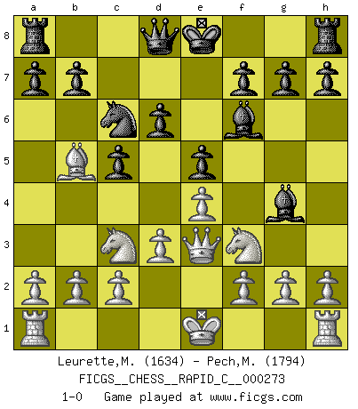 Last move : 1-0 2021 December 2 3:3:17 [Event "FICGS__CHESS__RAPID_C__000273"] [Site "FICGS"] [Date "2021.10.24"] [Round "1"] [White "Leurette,Marc-Antoine"] [Black "Pech,Matej"] [Result "1-0"] [WhiteElo "1634"] [BlackElo "1794"] 1.e4 c5 2.Nc3 Nc6 3.Nf3 d6 4.Bb5 e5 5.d3 Nf6 6.Bg5 Be7 7.Bxf6 Bxf6 8.Qd2 Bg4 9.Qe3 1-0 Sicilian : Closed, 2...Nc6 Player White won this chess game. Follow this game move after move (download)In order to improve your game, you must study the endgame before everything else, for whereas the endings can be studied and mastered by themselves, the middle game and the opening must be studied in relation to the endgame. (Jose Raul Capablanca) Sicherlich können nur Meister einen Stil haben. Daß ein nicht-Meister auch nur ein einziges Mal in seinem Leben eine Partie folgerecht durchführte, habe ich niemals bemerkt. (Emanuel Lasker) El Rey es una pieza de pelea. ¡Usenlo!. (Wilhelm Steinitz) Je ne crois pas en la psychologie, je crois aux bons coups. (Robert Fischer) Over-the-board chess is the favorite of mortals, correspondence chess is the favorite of the gods. (Eduard Dyckhoff)