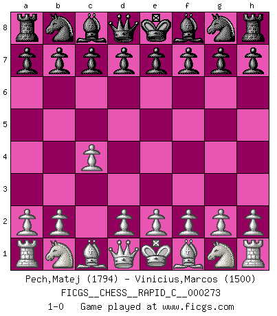 Last move : 1-0 2021 November 23 15:51:10 [Event "FICGS__CHESS__RAPID_C__000273"] [Site "FICGS"] [Date "2021.10.24"] [Round "1"] [White "Pech,Matej"] [Black "Vinicius,Marcos"] [Result "1-0"] [WhiteElo "1794"] [BlackElo "1500"] 1.c4 1-0 This chess game has been lost on time (started : 2021.10.24 3:22:5) English Opening Player White won this chess game. Follow this game move after move (download)Chess books should be used as we use glasses: to assist the sight, although some players make use of them as if they thought they conferred sight. (Jose Raul Capablanca) Im Schach nämlich geht es darum, daß Ich des Gegners klein zu kriegen, sein Ego zu zerbrechen und zu zermahlen, seine Selbstachtung zu zertreten und zu verscharren und seine ganze mißachtenswerte sogenannte Persönlichkeit ein für alle Mal tot zu hacken und zu zerstampfen und dadurch die menschliche Gesellschaft von einer stinkenden Pestbeule zu befreien. Es ist ein königliches Spiel. (Robert James Fischer) Siempre es mucho mejor sacrificar las piezas de tu oponente. (Savielly Tartakover) Les échecs sont plus proches de l'art de l'assassinat que de l'art de la guerre. (Arturo Perez-Reverte) Dave, my mind is going. I can feel it. (HAL 9000 in 2001, a space odyssey)