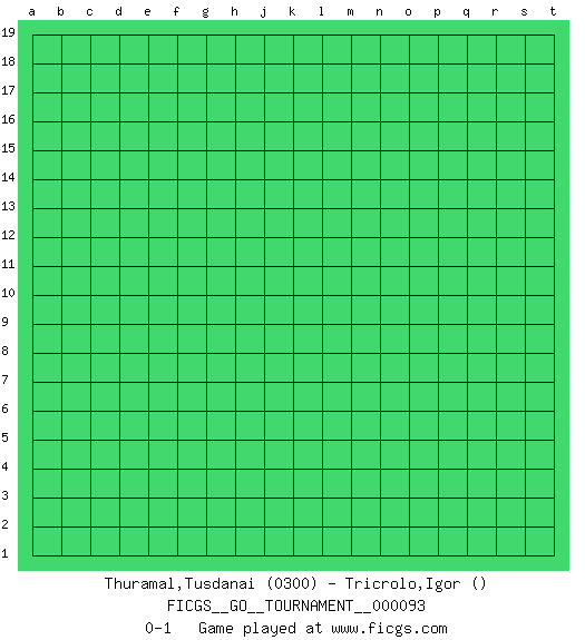 Last move : 0-1 2021 November 23 15:51:10 [Event "FICGS__GO__TOURNAMENT__000093"] [Site "FICGS"] [Date "2021.10.24"] [Round "1"] [Black "Thuramal,Tusdanai"] [White "Tricrolo,Igor"] [Result "0-1"] [Rating 1 "0300"] 0-1 This go game has been lost on time (started : 2021.10.24 6:41:32) Here are the names of the openings (joseki) played in the four corners : Player White won this Go (weiqi, baduk) game. Follow this game move after move (download)If you have lost four corners, resign. (Anonymous) Once you start thinking you have nothing left to learn, you have everything to learn. (Steve Badget)