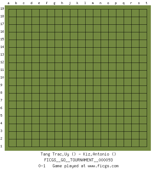 Last move : 0-1 2021 November 23 15:51:10 [Event "FICGS__GO__TOURNAMENT__000093"] [Site "FICGS"] [Date "2021.10.24"] [Round "1"] [Black "Tang Trac,Uy"] [White "Kiz,Antonio"] [Result "0-1"] 0-1 This go game has been lost on time (started : 2021.10.24 6:41:32) Here are the names of the openings (joseki) played in the four corners : Player White won this Go (weiqi, baduk) game. Follow this game move after move (download)If you cannot succeed, then die gloriously. (Chinese proverb) The ultimate in disposing one's troops is to be without ascertainable shape. Then the most penetrating spies cannot pry in nor can the wise lay plans against you. (Sun Tzu)