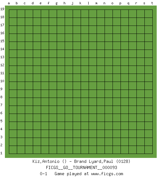 Last move : 0-1 2021 November 23 15:51:10 [Event "FICGS__GO__TOURNAMENT__000093"] [Site "FICGS"] [Date "2021.10.24"] [Round "1"] [Black "Kiz,Antonio"] [White "Brand Lyard,Paul"] [Result "0-1"] [Rating 2 "0128"] 0-1 This go game has been lost on time (started : 2021.10.24 6:41:32) Here are the names of the openings (joseki) played in the four corners : Player White won this Go (weiqi, baduk) game. Follow this game move after move (download)Territory really exists only in the end. (Pierre Audouard) Internal peace cannot coexist with external war. (Don Groves)