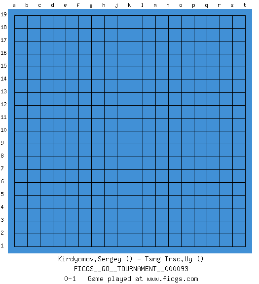 Last move : 0-1 2021 November 23 15:51:10 [Event "FICGS__GO__TOURNAMENT__000093"] [Site "FICGS"] [Date "2021.10.24"] [Round "1"] [Black "Kirdyomov,Sergey"] [White "Tang Trac,Uy"] [Result "0-1"] 0-1 This go game has been lost on time (started : 2021.10.24 6:41:32) Here are the names of the openings (joseki) played in the four corners : Player White won this Go (weiqi, baduk) game. Follow this game move after move (download)While the Baroque rules of chess could only have been created by humans, the rules of go are so elegant, organic, and rigorously logical that if intelligent life forms exist elsewhere in the universe, they almost certainly play go. (Edward Lasker, international chess master) All the troubles of the world come from being unable to sit alone in a quiet room. (Blaise Pascal)