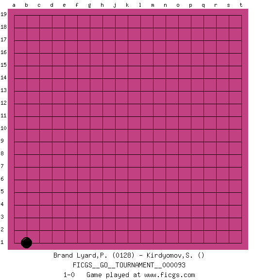 Last move : 1-0 2021 November 23 15:51:10 [Event "FICGS__GO__TOURNAMENT__000093"] [Site "FICGS"] [Date "2021.10.24"] [Round "1"] [Black "Brand Lyard,Paul"] [White "Kirdyomov,Sergey"] [Result "1-0"] [Rating 1 "0128"] 1.b1 1-0 This go game has been lost on time (started : 2021.10.24 6:41:32) Here are the names of the openings (joseki) played in the four corners : Corner d4 : b1 1-0 This joseki is unknown. A weak or weird move has probably been played in this corner. Player Black won this Go (weiqi, baduk) game. Follow this game move after move (download)Go is essentially a form of harmony. Go in the 21st century will have to be go of the 'harmony of the six points - the four quarters, the above and the below.' As in life we will need to view the whole rather than the part. Japanese go has focused too heavily on the local (joseki) rather than the whole for 300 years. The reason the Chinese and Koreans are overtaking the Japanese is that they are closer to achieve this whole-board view. (Go Seigen, 9p, 1994) Waiting for chance ? Play in casinos. (FICGS proverb)