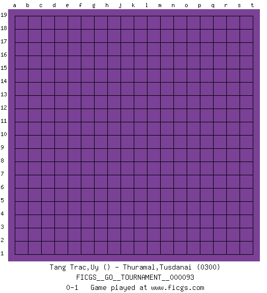Last move : 0-1 2021 November 23 15:51:10 [Event "FICGS__GO__TOURNAMENT__000093"] [Site "FICGS"] [Date "2021.10.24"] [Round "1"] [Black "Tang Trac,Uy"] [White "Thuramal,Tusdanai"] [Result "0-1"] [Rating 2 "0300"] 0-1 This go game has been lost on time (started : 2021.10.24 6:41:32) Here are the names of the openings (joseki) played in the four corners : Player White won this Go (weiqi, baduk) game. Follow this game move after move (download)Sacrifice for shape. (Anonymous) You lose, general Kenobi. (General Grievous in Star Wars ep.3)