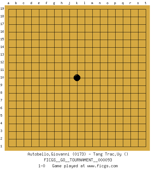 Last move : 1-0 2021 November 23 15:51:10 [Event "FICGS__GO__TOURNAMENT__000093"] [Site "FICGS"] [Date "2021.10.24"] [Round "1"] [Black "Autobello,Giovanni"] [White "Tang Trac,Uy"] [Result "1-0"] [Rating 1 "0173"] 1.k10 1-0 This go game has been lost on time (started : 2021.10.24 6:41:32) Here are the names of the openings (joseki) played in the four corners : Player Black won this Go (weiqi, baduk) game. Follow this game move after move (download)The second line is the line of defeat, the third line is the line of territory, and the fourth line is the line of influence. (Anonymous) All battles are fought by scared men who'd rather be someplace else. (John Wayne in the movie In harm's way)