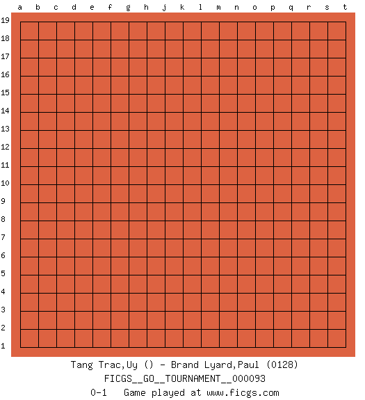 Last move : 0-1 2021 November 23 15:51:10 [Event "FICGS__GO__TOURNAMENT__000093"] [Site "FICGS"] [Date "2021.10.24"] [Round "1"] [Black "Tang Trac,Uy"] [White "Brand Lyard,Paul"] [Result "0-1"] [Rating 2 "0128"] 0-1 This go game has been lost on time (started : 2021.10.24 6:41:32) Here are the names of the openings (joseki) played in the four corners : Player White won this Go (weiqi, baduk) game. Follow this game move after move (download)To emphasize the lack of determination in his moves, one speaks of chance. (Pierre Audouard) Somewhere in the world there is an epigram for every dilemma. (Hendrik Willem van Loon)