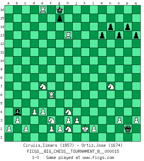 Last move : 1-0 2022 June 7 1:14:34 [Event "FICGS__BIG_CHESS__TOURNAMENT_B__000015"] [Site "FICGS"] [Date "2021.10.24"] [Round "1"] [White "Cirulis,Ilmars"] [Black "Ortiz,Jose"] [Result "1-0"] [WhiteElo "1857"] [BlackElo "1674"] 1.d2-d4 d15-d13 2.j2-h4 c16-f13 3.c1-j7 f13-g14 4.h1-l4 l15-l14 5.l4-b13 g16-f14 6.b13-b15 b16-d15 7.b15-c15 e16-c16 8.c15-g11 k15-k14 9.b1-a3 c16-c8 10.n2-n4 f14-e12 11.g11-j9 l16-k15 12.o1-h7 e15-e13 13.h7-k9 f15-f13 14.j9-d9 c8-c13 15.j7-c13 d15-c13 16.d9-d13 a16-b16 17.d13-e13 f16-d14 18.e13-a9 a15-a14 19.a3-c4 b16-b4 20.b2-b3 h15-f14 21.a9-a5 b4-b9 22.a5-k14 m16-l16 23.a1-d1 d14-g11 24.k14-k10 p16-o14 25.d1-d3 g11-j9 26.k10-c10 b9-f9 27.d3-f3 j9-f6 28.k9-l10 f9-f10 29.l10-g14 j15-g14 30.c10-f10 e12-f10 31.f3-f6 c13-d11 32.m2-m4 k16-h15 33.e2-e4 p15-p14 34.p1-n2 n15-n14 35.l1-o4 o16-e7 36.f6-j6 f14-g12 37.c4-e5 h15-j13 38.o4-j9 q16-n16 39.j9-o14 m15-m14 40.o14-h8 h16-q8 41.e5-g6 e7-b4 42.e1-e3 j16-h15 43.m1-m3 b4-d2 44.e3-f3 d11-e9 45.h8-f10 g12-f10 46.f3-f10 d2-a5 47.f10-f13 l16-e16 48.f13-f8 q8-q4 49.n2-p3 e9-d7 50.f8-f7 d7-e9 51.f7-f5 a5-c3 52.g1-f3 e16-e13 53.m3-o3 o15-o13 54.o3-o8 q4-n7 55.o8-j8 n7-h7 56.p3-o5 e9-f7 57.j8-j7 h7-g8 58.f5-f7 e13-e8 59.f1-b5 e8-b8 60.b5-j12 g8-l12 61.k1-l3 h14-h13 62.j12-f9 g14-j15 63.f9-a14 q15-q13 64.a14-f9 c3-b4 65.g6-e7 b8-l8 66.o5-n7 l8-l3 67.k2-l3 l12-l3 68.j1-k1 l3-m4 69.j7-j13 m4-n4 70.q1-m1 m14-m13 71.m1-m9 n16-g16 72.m9-k9 k15-l16 73.o2-o3 n4-q7 74.q2-q3 j15-g14 75.j13-j9 j14-j13 76.f9-l14 q7-o7 77.l14-k13 l16-j14 78.k13-j14 h15-j14 79.f7-g7 o7-l4 80.g7-g14 j14-h15 81.g14-e14 l4-o1 82.k1-k2 g16-j16 83.k9-k15 j16-j15 84.k15-j15 h15-j15 85.j9-j13 j15-h15 86.j13-h13 h15-g16 87.j6-f6 o1-p2 88.e14-e16 1-0 Follow this game move after move (download)You may learn much more from a game you lose than from a game you win. You will have to lose hundreds of games before becoming a good player. (Jose Raul Capablanca) In der Schule lernt man nichts. Es ist nur Zeitverschwendung. (Robert James Fischer) Algunos sacrificios son sólidos, los demás son míos. (Mikhail Tal) Toutes choses étant égales, c'est la conviction qui gagne. Alliée à une volonté de vaincre, elle sert de détonateur, suscite des idées, disperse les doutes et aide à penser clairement. (Robert Fischer) There is a great deal of difference between an eager man who wants to read a book and a tired man who wants a book to read. (G.K. Chesterton)