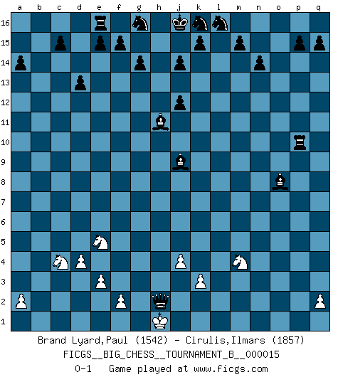 Last move : 0-1 2021 November 1 13:56:16 [Event "FICGS__BIG_CHESS__TOURNAMENT_B__000015"] [Site "FICGS"] [Date "2021.10.24"] [Round "1"] [White "Brand Lyard,Paul"] [Black "Cirulis,Ilmars"] [Result "0-1"] [WhiteElo "1542"] [BlackElo "1857"] 1.j2-k4 n15-n14 2.h1-o7 g15-g14 3.o7-o15 p16-o14 4.d2-d4 m16-n16 5.c1-p13 n16-n15 6.o15-n15 o16-n15 7.p13-o14 n15-o14 8.e2-e3 o14-j9 9.f1-a6 h16-b10 10.n2-n3 b10-b2 11.b1-d2 b2-c2 12.g1-f3 c2-j8 13.e1-c1 q16-o16 14.o2-o3 o16-o9 15.o1-c12 d15-d13 16.c12-b13 b16-c14 17.b13-c14 b15-c14 18.c1-c14 o9-k9 19.m2-m4 k9-k4 20.k2-k3 k4-k9 21.j3-j4 c16-h11 22.a1-b1 j8-g6 23.a6-e10 g6-g2 24.n3-n4 g2-h3 25.e10-b13 a15-a14 26.b13-a12 h3-h8 27.c14-c13 h8-c13 28.a12-e16 a16-e16 29.l1-d8 h15-j13 30.d8-j13 h14-j13 31.b1-b15 f16-h14 32.m1-m3 j13-j12 33.m3-l3 c13-m4 34.j1-h1 m4-o2 35.l3-l15 o2-p2 36.l15-l16 j15-l16 37.b15-a15 p2-q1 38.p1-q3 q1-o3 39.q3-p5 o3-n3 40.p5-n6 n3-a15 41.n6-m8 k9-k10 42.f3-e5 a15-k6 43.m8-o7 k6-p6 44.o7-q8 p6-q7 45.q8-p10 k10-p10 46.d2-c4 q7-n4 47.k1-l3 n4-l2 48.l3-k5 h14-o8 49.k5-m4 l2-h2 0-1 Follow this game move after move (download)When the Chess game is over, the Pawn and the King go back to the same box. (Irish saying) Je mehr wir mit Computern analysieren, desto mehr glauben wir an Verteidigung. (Vladimir Kramnik) Personalmente, yo prefiero mirar hacia el futuro en donde un programa de computadora gane el título mundial de Ajedrez. La humanidad necesita una lección de humildad. (Richard Dawkings) Soyez une menace à chaque fois que vous vous asseyez pour jouer. (Ken Smith) Memory is a way of holding onto the things you love, the things you are, the things you never want to lose. (from the television show: The Wonder Years)