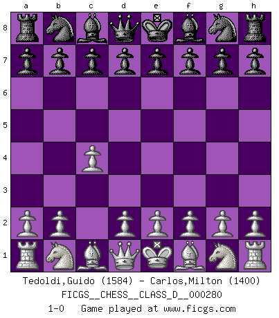 Last move : 1-0 2021 December 5 13:7:11 [Event "FICGS__CHESS__CLASS_D__000280"] [Site "FICGS"] [Date "2021.10.26"] [Round "1"] [White "Tedoldi,Guido"] [Black "Carlos,Milton"] [Result "1-0"] [WhiteElo "1584"] [BlackElo "1400"] 1.c4 1-0 This chess game has been lost on time (started : 2021.10.26 1:5:54) English Opening Player White won this chess game. Follow this game move after move (download)In blitz, the Knight is stronger than the Bishop. (Vlastimil Hort) Darum geht es im Schach. Einen Tag gibst du deinem Gegner eine Lektion, am nächsten Tag gibt er dir eine. (Robert James Fischer) El Ajedrez detiene a su maestro dentro de sus propios vínculos, encadenando la mente y el cerebro, por lo que la libertad interior del mas fuerte debe sufrir. (Albert Einstein) Des idées, des idées, j'en ai cent, j'en ai mille. Des bonnes, des mauvaises, applicables, irréalisables... Il suffit de faire le tri ! (Roos) Whatever you do, don't be bored. This is absolutely the most exciting time we could have possibly hoped to be alive. And things are just starting. (From movie Waking life)