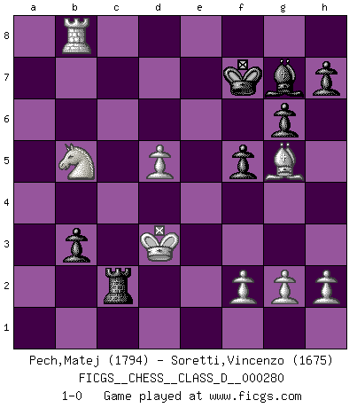Last move : 1-0 2022 May 22 4:38:59 [Event "FICGS__CHESS__CLASS_D__000280"] [Site "FICGS"] [Date "2021.10.26"] [Round "1"] [White "Pech,Matej"] [Black "Soretti,Vincenzo"] [Result "1-0"] [WhiteElo "1794"] [BlackElo "1675"] 1.d4 d5 2.c4 Nf6 3.Nf3 g6 4.Nc3 Bg7 5.cxd5 Nxd5 6.e4 Nxc3 7.bxc3 c5 8.Be3 O-O 9.Rc1 cxd4 10.cxd4 Bg4 11.Be2 Qa5+ 12.Qd2 Qxd2+ 13.Nxd2 Bxe2 14.Kxe2 Na6 15.Rc4 b5 16.Rc3 Rfc8 17.Rhc1 Rxc3 18.Rxc3 Rd8 19.Nf3 f6 20.Ra3 Rd6 21.d5 e6 22.Nd4 b4 23.Ra5 exd5 24.Nb5 Rc6 25.exd5 Rc2+ 26.Kd3 b3 27.Rxa6 Rxa2 28.Rxa7 f5 29.Rb7 Rc2 30.Rb8+ Kf7 31.Bg5 1-0 QGD : Marshall defense Kingside Castling by player Black (move 8) Player White won this chess game. Follow this game move after move (download)In order to improve your game, you must study the endgame before everything else, for whereas the endings can be studied and mastered by themselves, the middle game and the opening must be studied in relation to the endgame. (Jose Raul Capablanca) Wenn es im Universum noch irgendwo intelligente Lebewesen gibt, dann kennen sie Go. (Emanuel Lasker) Personalmente, yo prefiero mirar hacia el futuro en donde un programa de computadora gane el título mundial de Ajedrez. La humanidad necesita una lección de humildad. (Richard Dawkings) Je ne crois pas en la psychologie, je crois aux bons coups. (Robert Fischer) If you don't practice you don't deserve to win. (Andre Agassi)