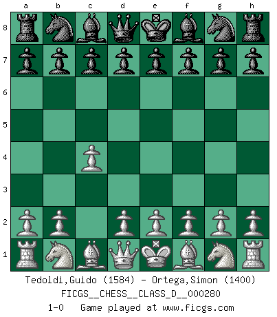Last move : 1-0 2021 December 5 13:7:11 [Event "FICGS__CHESS__CLASS_D__000280"] [Site "FICGS"] [Date "2021.10.26"] [Round "1"] [White "Tedoldi,Guido"] [Black "Ortega,Simon"] [Result "1-0"] [WhiteElo "1584"] [BlackElo "1400"] 1.c4 1-0 This chess game has been lost on time (started : 2021.10.26 1:5:54) English Opening Player White won this chess game. Follow this game move after move (download)The battle for the ultimate truth will never be won. And that's why Chess is so fascinating. (Hans Kmoch) Die starken Figuren des Gegners muss man abtauschen. (José Raúl Capablanca) El Ajedrez, como la música, como el amor, tiene el poder de hacer feliz a la gente. (Siegbert Tarrasch) Si rien de grave n'est détecté lors de l'analyse d'une position, on joue alors le coup. Seconde règle de Blumenfeld. There are two kinds of tragedy in this world, one is not getting what you want and the other is getting. (Lord of war)