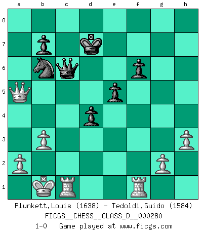 Last move : 1-0 2022 May 21 2:2:57 [Event "FICGS__CHESS__CLASS_D__000280"] [Site "FICGS"] [Date "2021.10.26"] [Round "1"] [White "Plunkett,Louis"] [Black "Tedoldi,Guido"] [Result "1-0"] [WhiteElo "1638"] [BlackElo "1584"] 1.d4 e6 2.c4 c5 3.d5 d6 4.Nc3 h5 5.e4 e5 6.Nge2 Nf6 7.f3 Be7 8.Bd2 a6 9.Ng3 g6 10.Qb3 O-O 11.O-O-O Nbd7 12.Kb1 Re8 13.Bd3 Nb6 14.h3 Bd7 15.f4 h4 16.Nge2 Nh5 17.f5 gxf5 18.exf5 f6 19.Be1 Ng7 20.Rf1 Kf7 21.Bxh4 Rh8 22.Bg3 Rh5 23.Qc2 Qc8 24.Qb3 Qd8 25.Be1 Nxf5 26.Bf2 Nd4 27.Bxd4 cxd4 28.Qc2 Rg5 29.Ne4 Rg7 30.b3 a5 31.c5 Rc8 32.Qd2 dxc5 33.d6 Rc6 34.dxe7 Kxe7 35.N2g3 Qf8 36.Bb5 Re6 37.Nf5+ Kd8 38.Nxg7 Qxg7 39.Nxc5 Qe7 40.Nxe6+ Qxe6 41.Bxd7 Kxd7 42.Qxa5 Qc6 43.Rc1 1-0 Queen's pawn Kingside Castling by player Black (move 10) Queenside Castling by player White (move 11) Player White won this chess game. Follow this game move after move (download)Morphy was probably the greatest genius of them all. (Bobby Fischer) Gewöhnliche Menschen denken nur daran, wie sie ihre Zeit verbringen. Ein intelligenter Mensch versucht, sie auszunutzen. (Arthur Schopenhauer) ¿Se han dado cuenta de que Fischer casi nunca ha tenido piezas malas? El las intercambia y las piezas malas se quedan con sus oponenets. (Yuri Balashov) La vérité est comme le meilleur coup aux échecs : elle existe, mais il faut la chercher. (Arturo Perez-Reverte) Life is the sum of all your choices. (Albert Camus)