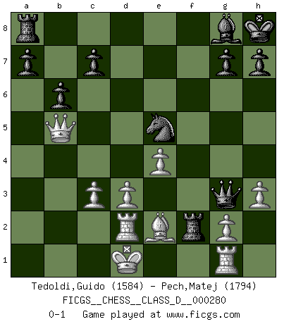 Last move : 0-1 2022 March 29 4:32:39 [Event "FICGS__CHESS__CLASS_D__000280"] [Site "FICGS"] [Date "2021.10.26"] [Round "1"] [White "Tedoldi,Guido"] [Black "Pech,Matej"] [Result "0-1"] [WhiteElo "1584"] [BlackElo "1794"] 1.c4 e5 2.Nc3 Nc6 3.d3 Nf6 4.Nf3 d5 5.cxd5 Nxd5 6.e4 Nxc3 7.bxc3 Bc5 8.h3 O-O 9.Be2 Qf6 10.Rb1 b6 11.Be3 Bxe3 12.fxe3 Qg6 13.Rg1 f5 14.exf5 Bxf5 15.Qb3+ Kh8 16.e4 Be6 17.Qb5 Bxa2 18.Rb2 Bg8 19.Nxe5 Qg3+ 20.Kd1 Nxe5 21.Rd2 Rf2 0-1 English : Sicilian Reversed Kingside Castling by player Black (move 8) Player Black won this chess game. Follow this game move after move (download)After black's reply to 1.e4 with 1..e5, leaves him always trying to get into the game. (Howard Staunton) Vom Schach wurde gesagt das Leben sei dafür nicht lange genug. Aber das ist der Fehler des Lebens, nicht des Schach'. (Irving Chernev) Durante una competencia de Ajedrez, un Maestro de Ajedrez deberá ser una combinación de presa de caza y un Monge. (Alexander Alekhine) J'ai vu le vaincu d'Echecs jouer des années durant dans l'espoir de la fête de la victoire. Car tu es plus riche de ce qu'elle existe si même elle n'est point pour toi. Ainsi de la perle du fond des mers. (Antoine de Saint-Exupéry) Humor is by far the most significant activity of the human brain. (Edward De Bono)