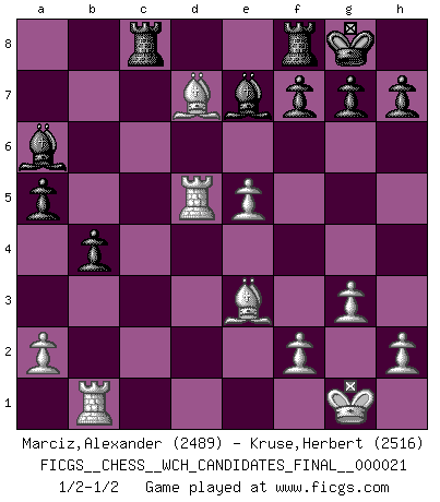 Last move : 1/2-1/2 2022 January 4 1:57:42 [Event "FICGS__CHESS__WCH_CANDIDATES_FINAL__000021"] [Site "FICGS"] [Date "2021.10.27"] [Round "4"] [White "Marciz,Alexander"] [Black "Kruse,Herbert"] [Result "1/2-1/2"] [WhiteElo "2489"] [BlackElo "2516"] 1.Nf3 Nf6 2.c4 c5 3.Nc3 Nc6 4.g3 d5 5.d4 e6 6.cxd5 Nxd5 7.Bg2 cxd4 8.Nxd4 Nxc3 9.bxc3 Nxd4 10.Qxd4 Qxd4 11.cxd4 Bd6 12.O-O Rb8 13.e4 b5 14.e5 Be7 15.Rd1 O-O 16.Be3 a5 17.Bc6 Ba6 18.Rab1 b4 19.d5 exd5 20.Rxd5 Rbc8 21.Bd7 1/2-1/2 Reti Opening Kingside Castling by player White (move 12) Kingside Castling by player Black (move 15) This chess game ended in a draw. Follow this game move after move (download)Chess is a forcing house where the fruits of character can ripen more fully than in life. (Edward Morgan Foster) Die Neutralität betrachte ich als eine schwere Krankheit. (Viktor Kortschnoi) Un juego de Ajedrez es un dialogo, una conversación entre un jugador y su oponente. Cada movimiento del oponente puede contener amenazas o tropiezos, pero un jugador no se puede defender de las amenazas o tomar ventaja de los tropiezos si es que no se pregunta a sí mismo: ¿Que es lo que mi oponente va a hacer después de cada movida?. (Bruce A. Moon) Avant la finale, les dieux ont créé le milieu de partie. (Tarrasch) Luck has a peculiar habit of favoring those who don't depend on it. (Author unknown)