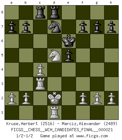 Last move : 1/2-1/2 2022 January 4 5:50:29 [Event "FICGS__CHESS__WCH_CANDIDATES_FINAL__000021"] [Site "FICGS"] [Date "2021.10.27"] [Round "5"] [White "Kruse,Herbert"] [Black "Marciz,Alexander"] [Result "1/2-1/2"] [WhiteElo "2516"] [BlackElo "2489"] 1.e4 c5 2.Nf3 d6 3.d4 cxd4 4.Nxd4 Nf6 5.Bb5+ Bd7 6.c4 e5 7.Nf5 Nxe4 8.Qd5 Nc5 9.Nxd6+ Bxd6 10.Qxd6 Qe7 11.Bxd7+ Nbxd7 12.Qxe7+ Kxe7 13.Nc3 Nd3+ 14.Kd2 Nxc1 15.Nd5+ Kd6 16.Raxc1 Rac8 17.Rhd1 Ke6 18.Rc3 Rhd8 1/2-1/2 Sicilian This chess game ended in a draw. Follow this game move after move (download)Pawns: they are the soul of this game, they alone form the attack and defense. (Philidor) Stil? Ich habe keinen Stil! (Anatoly Karpov) La mitad de las variaciones que son calculadas en una partida de torneo, resultan ser completamente superfluas. Desafortunadamente, nadie sabe por adelantado cual mitad. (Jan Tinman) La tactique est l'élément le plus important du milieu de jeu. (Siegbert Tarrasch) A bird doesn't sing because it has an answer, it sings because it has a song. (Maya Angelou)