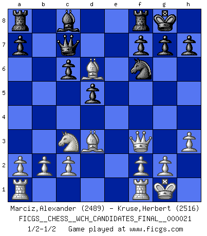 Last move : 1/2-1/2 2021 November 1 22:20:30 [Event "FICGS__CHESS__WCH_CANDIDATES_FINAL__000021"] [Site "FICGS"] [Date "2021.10.27"] [Round "6"] [White "Marciz,Alexander"] [Black "Kruse,Herbert"] [Result "1/2-1/2"] [WhiteElo "2489"] [BlackElo "2516"] 1.e4 e5 2.Nf3 Nc6 3.d4 exd4 4.Nxd4 Nf6 5.Nxc6 bxc6 6.Nc3 Bb4 7.Bd3 d5 8.exd5 O-O 9.O-O cxd5 10.h3 c6 11.Qf3 Bd6 12.Bf4 Qc7 13.Bxd6 1/2-1/2 Scotch : Schmidt variation Kingside Castling by player Black (move 8) Kingside Castling by player White (move 9) This chess game ended in a draw. Follow this game move after move (download)Chess problems demand from the composer the same virtues that characterize all worthwhile art: originality, invention, conciseness, harmony, complexity, and splendid insincerity. (Vladimir Nabokov) Der Partner hat auch seine Existenzberechtigung. (Savielly Grigorievitsch Tartakower) Las Aperturas te enseñan aperturas. ¡Los Finales te enseñan Ajedrez!. (Stephan Gerzadowicz) Celui qui prend des risques peut perdre, celui qui n'en prend pas perd toujours. (Xavier Tartacover) Some people are so afraid to die that they never begin to live. (Henry Van Dyke)