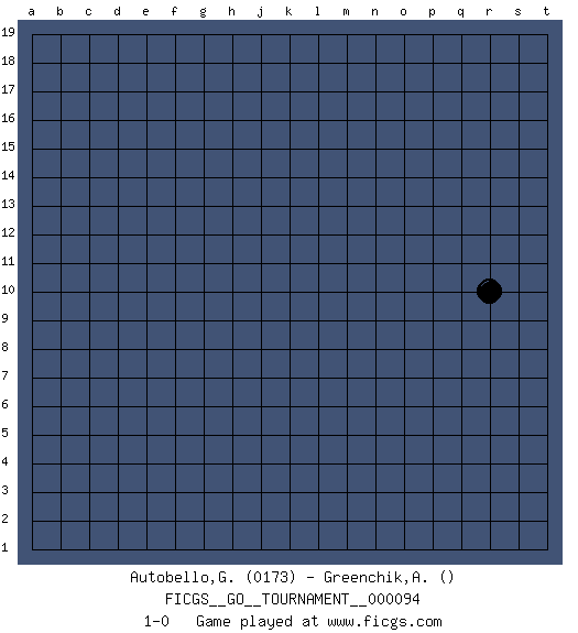 Last move : 1-0 2021 November 26 20:39:22 [Event "FICGS__GO__TOURNAMENT__000094"] [Site "FICGS"] [Date "2021.10.27"] [Round "1"] [Black "Autobello,Giovanni"] [White "Greenchik,Alex"] [Result "1-0"] [Rating 1 "0173"] 1.r10 1-0 This go game has been lost on time (started : 2021.10.27 13:30:39) Here are the names of the openings (joseki) played in the four corners : Player Black won this Go (weiqi, baduk) game. Follow this game move after move (download)Do not make moves that strengthen your opponent ! (Anonymous) If I had no sense of humor, I would long ago have committed suicide. (Mahatma Gandhi)