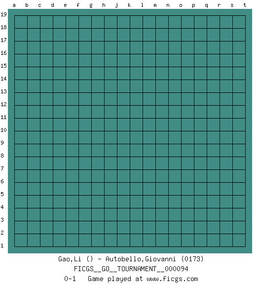 Last move : 0-1 2021 November 26 20:39:22 [Event "FICGS__GO__TOURNAMENT__000094"] [Site "FICGS"] [Date "2021.10.27"] [Round "1"] [Black "Gao,Li"] [White "Autobello,Giovanni"] [Result "0-1"] [Rating 2 "0173"] 0-1 This go game has been lost on time (started : 2021.10.27 13:30:39) Here are the names of the openings (joseki) played in the four corners : Player White won this Go (weiqi, baduk) game. Follow this game move after move (download)Every move brings change. (Pierre Audouard) Watch your thoughts; they become words. Watch your words; they become actions. Watch your actions; they become habits. Watch your habits; they become character. Watch your character; it becomes your destiny. (Frank Outlaw)