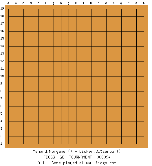 Last move : 0-1 2021 November 26 20:39:22 [Event "FICGS__GO__TOURNAMENT__000094"] [Site "FICGS"] [Date "2021.10.27"] [Round "1"] [Black "Menard,Morgane"] [White "Licker,Sitsanou"] [Result "0-1"] 0-1 This go game has been lost on time (started : 2021.10.27 13:30:39) Here are the names of the openings (joseki) played in the four corners : Player White won this Go (weiqi, baduk) game. Follow this game move after move (download)Be a little patient. Keshi works ! (Anonymous) Somehow our devils are never quite what we expect when we meet them face to face. (Nelson DeMille)