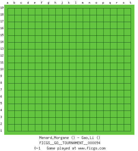 Last move : 0-1 2021 November 26 20:39:22 [Event "FICGS__GO__TOURNAMENT__000094"] [Site "FICGS"] [Date "2021.10.27"] [Round "1"] [Black "Menard,Morgane"] [White "Gao,Li"] [Result "0-1"] 0-1 This go game has been lost on time (started : 2021.10.27 13:30:39) Here are the names of the openings (joseki) played in the four corners : Player White won this Go (weiqi, baduk) game. Follow this game move after move (download)You have to like to win, and to learn to recognize the errors that gave you the victory. (Pierre Audouard) I take risks, sometimes patients die, but not taking risks causes more patients to die. So I guess my biggest problem is I've been cursed with the ability to do the math. (Gregory House, House M.D.)