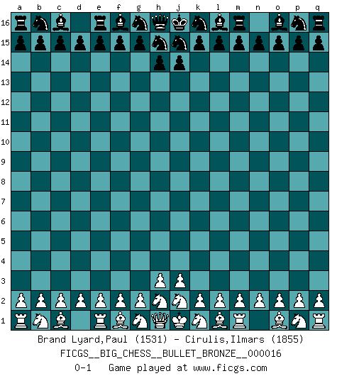 Last move : 0-1 2021 October 29 17:57:45 [Event "FICGS__BIG_CHESS__BULLET_BRONZE__000016"] [Site "FICGS"] [Date "2021.10.29"] [Round "1"] [White "Brand Lyard,Paul"] [Black "Cirulis,Ilmars"] [Result "0-1"] [WhiteElo "1531"] [BlackElo "1855"] 0-1 This big chess game has been lost on time (started : 2021.10.29 16:34:49) Follow this game move after move (download)Chess is like life. (Boris Spassky) Ich bin es gewohnt, das die Jugend mir überhaupt keinen Respekt entgegenbringt. (Alexander Morozewich) La estratégia requiere pensar, la táctica requiere observación. (Max Euwe) Les échecs, c'est l'art d'analyser. (Mikhail Botvinnik) Memory is a way of holding onto the things you love, the things you are, the things you never want to lose. (from the television show: The Wonder Years)