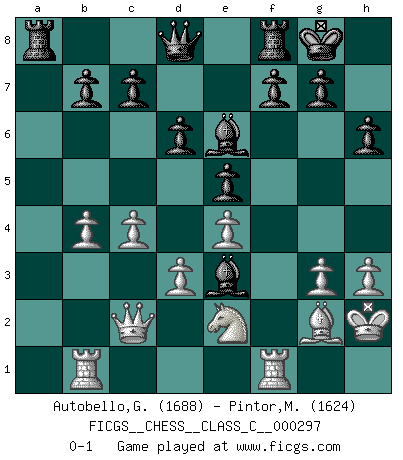 Last move : 0-1 2022 January 25 14:33:13 [Event "FICGS__CHESS__CLASS_C__000297"] [Site "FICGS"] [Date "2021.10.31"] [Round "1"] [White "Autobello,Giovanni"] [Black "Pintor,Manuel"] [Result "0-1"] [WhiteElo "1688"] [BlackElo "1624"] 1.c4 e5 2.Nc3 Bc5 3.Nf3 d6 4.g3 Nc6 5.Bg2 Bf5 6.O-O Nf6 7.d3 h6 8.a3 a5 9.e4 Bg4 10.Be3 Bd4 11.h3 Be6 12.Rb1 O-O 13.Qc2 Nh5 14.b4 axb4 15.axb4 Nxg3 16.fxg3 Bxe3+ 17.Kh2 Nd4 18.Nxd4 Bxd4 19.Ne2 Be3 0-1 English Opening Kingside Castling by player White (move 6) Kingside Castling by player Black (move 12) Player Black won this chess game. Follow this game move after move (download)The laws of Chess do not permit a free choice: you have to move whether you like it or not. (Emanuel Lasker) Moralische Siege zählen nicht. (Savielly Grigorievitsch Tartakower) El ganador de una partida es aquel jugador que hace el penúltimo error. (Savielly Tartakover) Les sacrifices démontrent seulement que quelqu'un a gaffé. (Savielly Tartacover) Life is like internet, nothing interesting, but noone want to leave it. (Ilmars Cirulis)