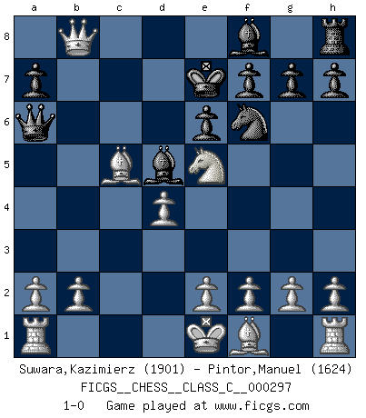 Last move : 1-0 2021 November 26 18:40:5 [Event "FICGS__CHESS__CLASS_C__000297"] [Site "FICGS"] [Date "2021.10.31"] [Round "1"] [White "Suwara,Kazimierz"] [Black "Pintor,Manuel"] [Result "1-0"] [WhiteElo "1901"] [BlackElo "1624"] 1.d4 d5 2.c4 c6 3.Nf3 Bf5 4.cxd5 Qxd5 5.Nc3 Qa5 6.Ne5 Nf6 7.Qb3 Be6 8.Qxb7 Bd5 9.Qxa8 Qb6 10.Na4 Qc7 11.Nc5 e6 12.Na6 Qa5+ 13.Bd2 Qxa6 14.Qxb8+ Ke7 15.Qc7+ Ke8 16.Qb8+ Ke7 17.Bb4+ c5 18.Bxc5+ 1-0 QGD Slav : 3.Nf3 Player White won this chess game. Follow this game move after move (download)Of all my Russian books, the defense contains and diffuses the greatest 'warmth' which may seem odd seeing how supremely abstract Chess is supposed to be. (Vladimir Nabokov) Schon mancher Spieler hat aufgegeben, um zu vermeiden, daß er eine Figur verliert. (Savielly Grigorievitsch Tartakower) En el Ajedrez, tal como en la vida, las bendiciones de hoy pueden ser el veneno del mañana. (Assaic) Mais n'est-ce pas déjà le limiter injurieusement que d'appeler les échecs un jeu? N'est-ce pas aussi une science, un art, ou quelque chose qui, comme le cercueil de Mahomet entre ciel et terre, est suspendu entre l'un et l'autre, et qui réunit un nombre incroyable de contraires ? (Stefan Zweig) But they are useless. They can only give you answers. (Pablo Picasso, about computers)