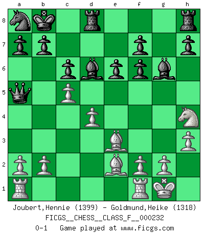 Last move : 0-1 2021 December 27 14:7:26 [Event "FICGS__CHESS__CLASS_F__000232"] [Site "FICGS"] [Date "2021.11.01"] [Round "1"] [White "Joubert,Hennie"] [Black "Goldmund,Heike"] [Result "0-1"] [WhiteElo "1399"] [BlackElo "1318"] 1.e4 d5 2.exd5 Qxd5 3.Nc3 Qa5 4.Nf3 Nf6 5.d4 Bg4 6.Be2 e6 7.Bd2 c6 8.Ne4 Qc7 9.Nxf6+ gxf6 10.c3 Nd7 11.O-O Bd6 12.h3 Bf5 13.Nh4 Bg6 14.Be3 O-O-O 15.Qa4 Kb8 16.c4 Nb6 17.Qa5 Na8 18.c5 Qxa5 0-1 Scandinavian (centre counter) defense Kingside Castling by player White (move 11) Queenside Castling by player Black (move 14) Player Black won this chess game. Follow this game move after move (download)The game of chess is the touchstone of the intellect. (Goethe) Es war undenkbar für die Behörden, dass ein sowjetischer Großmeister auf diese Art und Weise [Fischer-Taimanov 6:0] verliert, ohne dass es eine politischer Erklärung dafür gäbe. (Mark Taimanov) Yo considero que Fischer es uno de los expertos mas grandes de aperturas de siempre. (Keith Hayward) Avec des compensations pour le matériel en plus... (Anonyme) Life doesn't imitate art, it imitates bad television. (Woody Allen)
