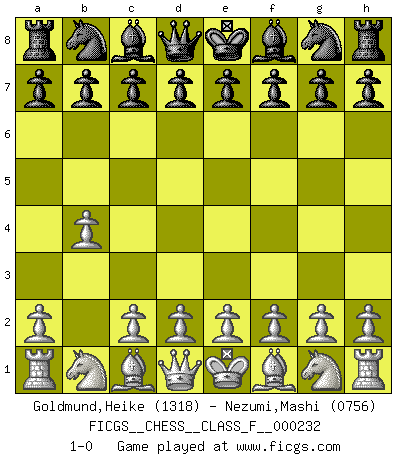 Last move : 1-0 2021 December 12 11:20:22 [Event "FICGS__CHESS__CLASS_F__000232"] [Site "FICGS"] [Date "2021.11.01"] [Round "1"] [White "Goldmund,Heike"] [Black "Nezumi,Mashi"] [Result "1-0"] [WhiteElo "1318"] [BlackElo "0756"] 1.b4 1-0 This chess game has been lost on time (started : 2021.11.01 15:45:13) Polish (Sokolsky) opening Player White won this chess game. Follow this game move after move (download)Fischer prefers to enter Chess history alone. (Miguel Najdorf) Alles was ich jemals tun will ist Schach spielen. (Robert James Fischer) El Ajedrez es un terrible juego. Si no controlas el centro, tu oponente tiene una posición mas holgada. Si tienes control del centro, ¡entonces realmente tu tienes algo de que preocuparte!. (Siegbert Tarrasch) Roi des jeux et jeu des rois, les échecs portent en eux un sentiment d'infini. Ils donnent à celui qui s'est efforcé d'en approfondir les arcanes l'impression de n'être pas à la mesure de l'homme; en fait, ils constituent un résumé de l'univers, un microcosme, et figurent cette grande échelle qui, dans les plans de la lumière descend jusqu'à la matière, qui des abîmes insondables remonte jusqu'en l'infini de Dieu. (Pyrame) The beginning is the most important part of the work. (Plato)
