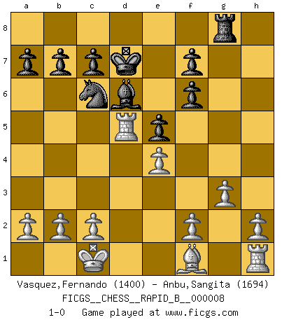 Last move : 1-0 2006 September 4 19:19:38 [Event "FICGS__CHESS__RAPID_B__000008"] [Site "FICGS"] [Date "2006.06.24"] [Round "1"] [White "Vasquez,Fernando"] [Black "Anbu,Sangita"] [Result "1-0"] [WhiteElo "1400"] [BlackElo "1694"] 1.e4 d6 2.d4 Nf6 3.Nc3 e5 4.dxe5 dxe5 5.Qxd8+ Kxd8 6.Nf3 Bd6 7.Bg5 Be6 8.O-O-O h6 9.Bxf6+ gxf6 10.Nh4 Ke7 11.Nd5+ Bxd5 12.Nf5+ Kd7 13.Rxd5 Rg8 14.Nxh6 Nc6 15.Nxg8 Rxg8 16.g3 1-0 This chess game has been lost on time (started : 2006.06.24 18:33:5) Pirc defense Queenside Castling by player White (move 8) Player White won this chess game. Follow this game move after move (download)My God, Bobby Fischer plays so simply. (Alexei Suetin) Auf jeden Fall musst du zuerst Rechtsanwalt werden, damit du deine eigenen Interessen und die deiner Familie vertreten kannst. [Brief an seinen Sohn] (José Raúl Capablanca) No todos los artistas son jugadores de Ajedrez, pero todos los jugadores de Ajedrez son artistas. (Marcel Duchamp) Seul un grand joueur sait à quel point il joue faiblement. (Xavier Tartacover) A person who never made a mistake never tried anything new. (Albert Einstein)