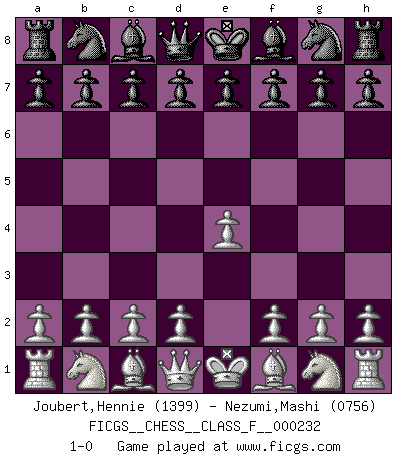 Last move : 1-0 2021 December 12 11:20:22 [Event "FICGS__CHESS__CLASS_F__000232"] [Site "FICGS"] [Date "2021.11.01"] [Round "1"] [White "Joubert,Hennie"] [Black "Nezumi,Mashi"] [Result "1-0"] [WhiteElo "1399"] [BlackElo "0756"] 1.e4 1-0 This chess game has been lost on time (started : 2021.11.01 15:45:13) King's pawn Opening Player White won this chess game. Follow this game move after move (download)Chess is war over the board. The object is to crush the opponents mind. (Bobby Fischer) Wer mein Gambit spielt, muß bereit sein, alle Brücken hinter sich abzubrechen. Es verändert den ganzen Menschen. Es wirkt wie ein Zauberstab und fördert verkümmerte, gute Charakter- eigenschaften wieder zu Tage. (Emil Joseph Diemer) Cualquier cambio de material en una posición debe venir por medio de un mate, una captura o promoción de Peón. (Purdy) Je crois qu'il existe des manières très spécifiques de jouer efficacement contre une machine. Evidemment, nous n'avons aucune chance en technique pure, parce que l'ordinateur calcule de manière parfaite. Mais lorsque nous faisons appel à notre cerveau, en utilisant l'intuition et la compréhension, alors nous restons beaucoup plus forts. (Anatoli Karpov) Inventor: A person who makes an ingenious arrangement of wheels, levers and springs, and believes it civilization. (Ambrose Bierce, The Devil's Dictionary)